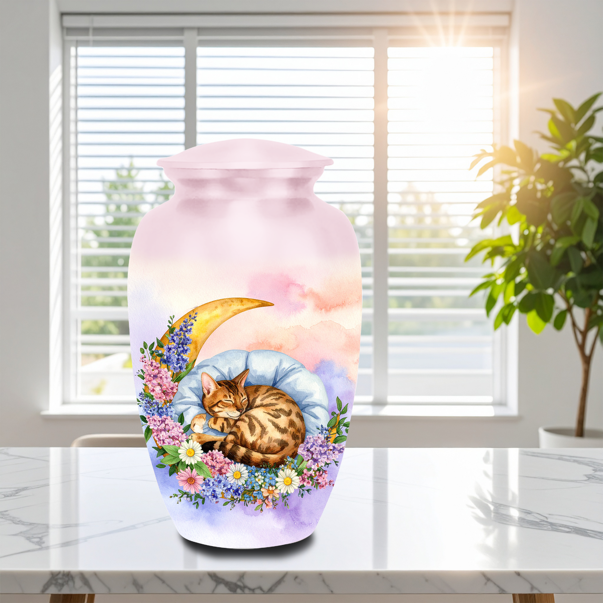 Crafted from high-quality aluminum, this pet memorial urn is designed for durability and long-lasting protection of ashes. The elegant design creates a meaningful keepsake that can be displayed at home, helping you preserve the loving memories of your cat for years to come.