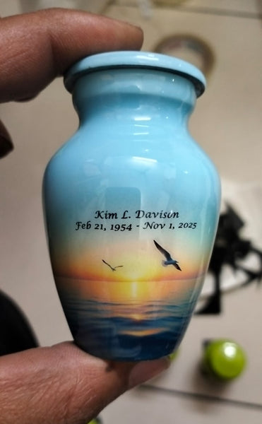 Designed to hold the ashes of a loved one, this cremation urn is available in both a full-size 10-inch version and a 3-inch keepsake. Whether you're honoring a parent, partner, or friend, the sunflower design symbolizes warmth, light, and eternal love.